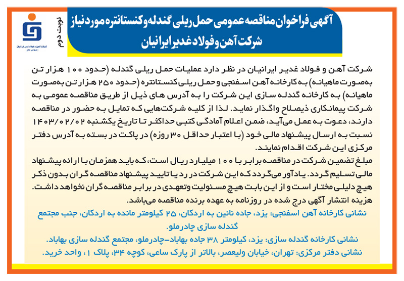 شركت آهن و فولاد غدیر ایرانیان در نظر دارد عملیات حمل ریلی گندله (حدود 100 هزار تن بصورت ماهیانه) به کارخانه آهن اسفنجی و حمل ریلی کنستانتره (حدود 250 هزار تن بصورت ماهیانه) به کارخانه گندله سازی این شرکت را به آدرس های ذیل از طریق مناقصه عمومی به شركت پیمانکاری ذیصلاح واگذار نماید. لذا از کلیه شرکتهایی که تمایل به حضور در مناقصه دارند، دعوت به عمل میآید، ضمن اعلام آمادگی کتبی حداکثر تا تاریخ یکشنبه 1403/02/02 نسبت به ارسال پیشنهاد مالی خود (با اعتبار حداقل 30 روزه) در پاکت در بسته به آدرس دفتر مرکزی این شرکت اقدام نمایند.